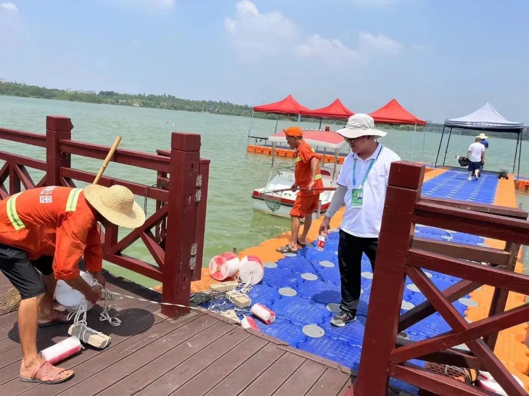 在A赛区,记者看到公园卫生管理人员在赛事工作人员的指导下打捞水面杂物,“前期我们对湖海塘水质进行再提升,目前水质已经全域达标。”相关负责人说。前段时间由于季节性绿藻问题,金华开发区开展了一系列湖海塘水质提升工作,一方面加大梅溪补水,完善湖海塘引水调度机制,得到梅溪补水约110万方,水体活性得到保障。另一方面实施中干渠清淤,目前已累计清淤18000m3,从根源上保障切断污染。同时公园管理方还加强了湖面保洁,远远看去湖面宽阔、水体洁净。