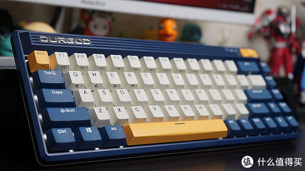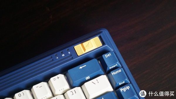 杜伽FUSION右上角的一抹亮黄色与键盘左侧的esc键和下方的空格键相互呼应,那是键盘的开关键,通过拨动设置使用模式。它的左侧是三盏指示灯,分别指示大写锁定、文件配置和电源电量。