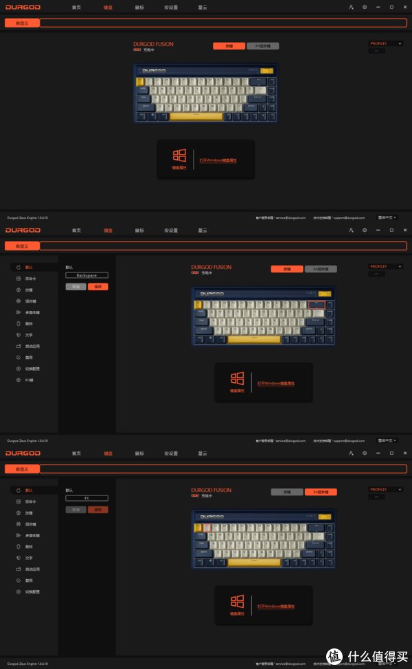 基于当下电子产品的智能倾向,杜伽当然也不会落后。杜伽的驱动软件叫做Durgod Zens Engine,支持有线和2.4G无线使用。它可以管理旗下所有的键盘,可以绑定键盘,单独编辑键盘每个按键的功能,自定义宏功能等等。
